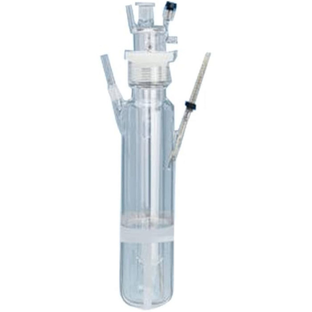 Glass, unjacketed reaction vessel design for use with our 7874 quartz and 7875 glass immersion wells. Instead of a standard taper joint, this reactor utilizes a height-adjustable, non-freezing #50 Ace-Thred. Also featured, a 14/20 angled joint for a sparger tube, a 24/40 vertical joint for a condenser and a #7 Ace-Thred for a thermometer. Vessel includes a flat-bottom that will accept the use of a stir magnet. Volumes indicated are total volumes; working volumes are approximately 40-50% of total volume.