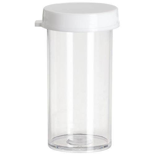 Rigid-wall styrene containers with tight fitting polyethylene snap-on caps. Glass-clear for complete visibility. Excellent for storing dry materials, powders, tablets, and more. Heavy walls for long service. Not for use at temperatures above 70°C (158°F). Each container holds approximately 19ml.