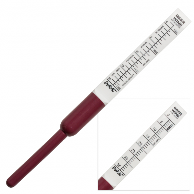Achieve perfect beer brewing and wine making results with DURAC Triple Scale Beer and Wine Hydrometers. Includes three scales, Specific Gravity, Potential Alcohol by Volume (PAV), and Brix, that provide invaluable data points when crafting beer, wine, kombucha, mead, cider, and more in either a commercial or home brew setting.