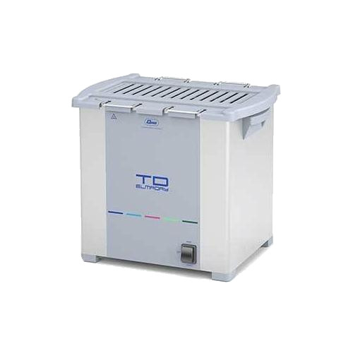 After cleaning in the ultrasonic bath, the cleaned item, still in the basket, is first rinsed in mains water and then immersed in a bath containing fully desalinated water or distilled water (to ensure item dries without leaving any stains). Alternatively, the cleaned item can be washed down with fully desalinated water from a laboratory bottle. The basket is then placed in the hot air dryer, where the hot air is activated when the lid is closed. The lid features ventilation slots to ensure that maximum air turbulence is created. The damp air is channelled to the outside. The lid also reduces energy consumption.