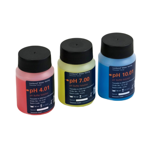 Lovibond's color-coded pH buffer solutions are suitable for calibrating pH electrodes with all types of pH meters, whether using automatic buffer recognition or manually adjustable pH values. Only standard reference materials traceable to NIST are used for production. The practical wide-neck round bottle can be used as a calibration vessel and can be simply refilled with dosing bottles.